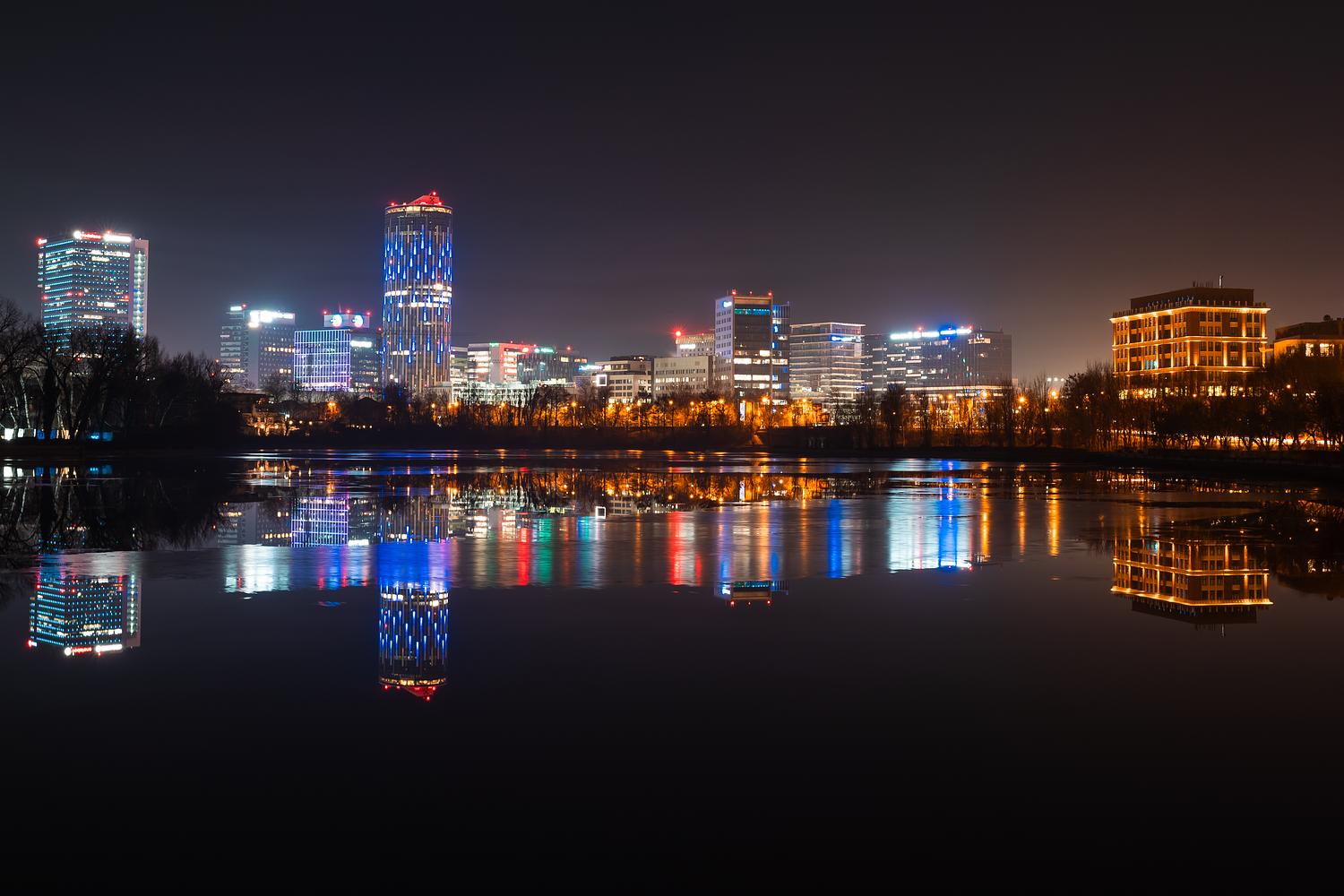 Illuminated towers with reflections over frozen lake. Bucharest. January 2025